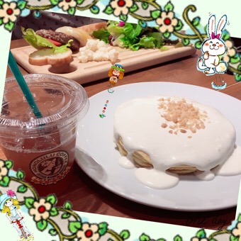 ホノルルコーヒーのマカダミアナッツクリームパンケーキとプランテーションアイスティ。