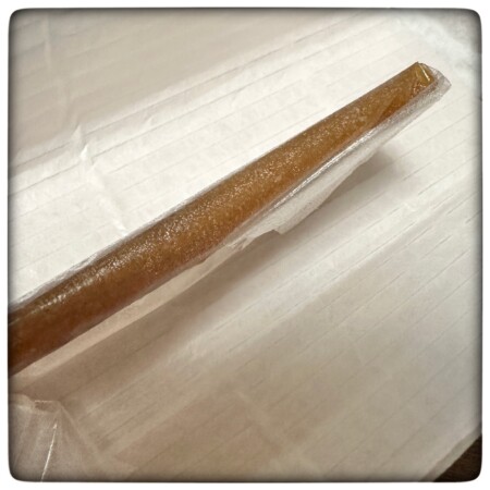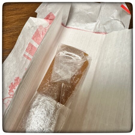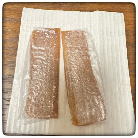 薄い紙を破って開けると、オブラートに包まれたきびだんごが現れます。しっかりとオブラートがついているタイプで周りの紙にはひっつかずさらさらしています。