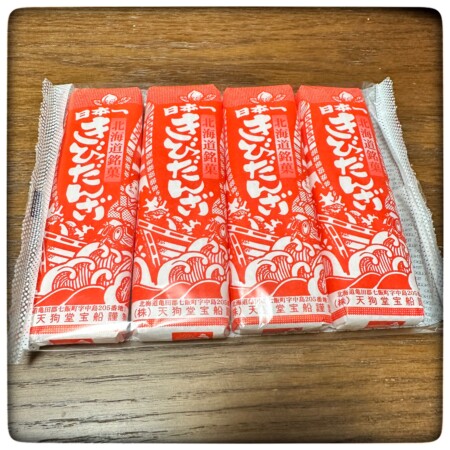 駄菓子コーナーに売っていた「天狗堂宝船」の「日本一きびだんご」は、赤い包装紙で北海道銘菓キビダンボと書かれています。4個入りが1袋になって150円くらいで購入できました。このきびだんごが一番好きで、このきびだんごにハマった理由でもあるお菓子です。