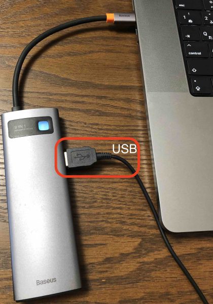 私が使用しているMacbook ProはUSBポートがありません。usb c ハブ(Baseus のものですが、今は売ってないみたいです)を使って接続させています。